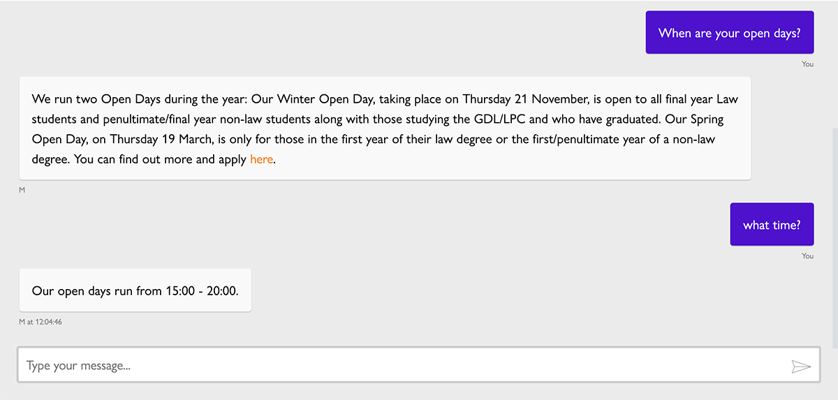 The Mishcon de Reya chatbot also included advanced functionality to help the chatbot understand that questions which had preceded them would have influence over questions that came later in the conversation.